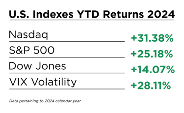 The United States’ Dow Jones, one of the oldest and most common equity indexes, increased 14.07% in 2024. This is almost double its average growth of 8.70% per year. The S&P 500 increased a whopping 25.18% last year. Even with that large increase, you’d be surprised to find that this is the norm for the S&P 500. Including the bearish years, the S&P has averaged an annual return of 10.13% since 1957. This year did much better than its average that’s for sure, but it’s had much greater bullish years than 2024. The Nasdaq Composite is one of our favorite indexes, as it is with many other investors, and are you ready to hear this? The Nasdaq Composite, one of the United States’ three largest indexes, increased 31.38% in 2024. Another index in the U.S. that's important to look at is the VIX volatility index. This index measures the market's expected volatility based on the S&P 500. The VIX increased 28.11% last year, which looks like quite a bit, but this doesn’t show us the full picture. The VIX generally increases and decreases +-30 to 50% throughout the year. Just looking at the three major U.S. indexes and the VIX, you’d think the other security markets around the world did well, and you’d be mostly correct.