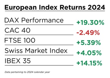 European markets also did extremely well last calendar year. Within our weekly investing newsletter, we watch five main European indexes. These are generally the most popular and largest of the continent. For Europe, we report on the DAX Performance from Germany, the CAC 40 from France, the FTSE 100 from London, the Swiss Market Index, and the IBEX 35 from Spain. The growth and/or decline of these five indexes gives us a strong representation of how Europe as a whole or other European indexes might be acting. In 2024, some European indexes did just as well as U.S. indexes, if not better. The DAX Performance Index from Germany increased by 19.30% last calendar year. France's CAC 40, an index of the country's top forty most significant stocks, decreased 2.49% in 2024. This was the only declining index for the five European indexes we watched. The FTSE 100, which indexes UK’s top 100 companies by market cap, increased a bit last year, but only 5.39%. The Swiss Market Index increased as well, only 4.05% though. The last European index we watch is the IBEX 35 from Spain, which increased a notable 14.15%.