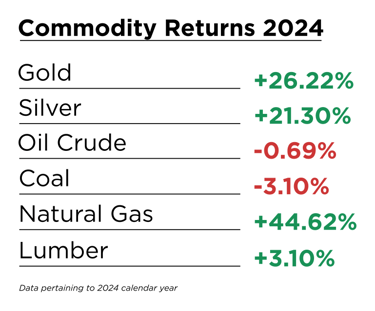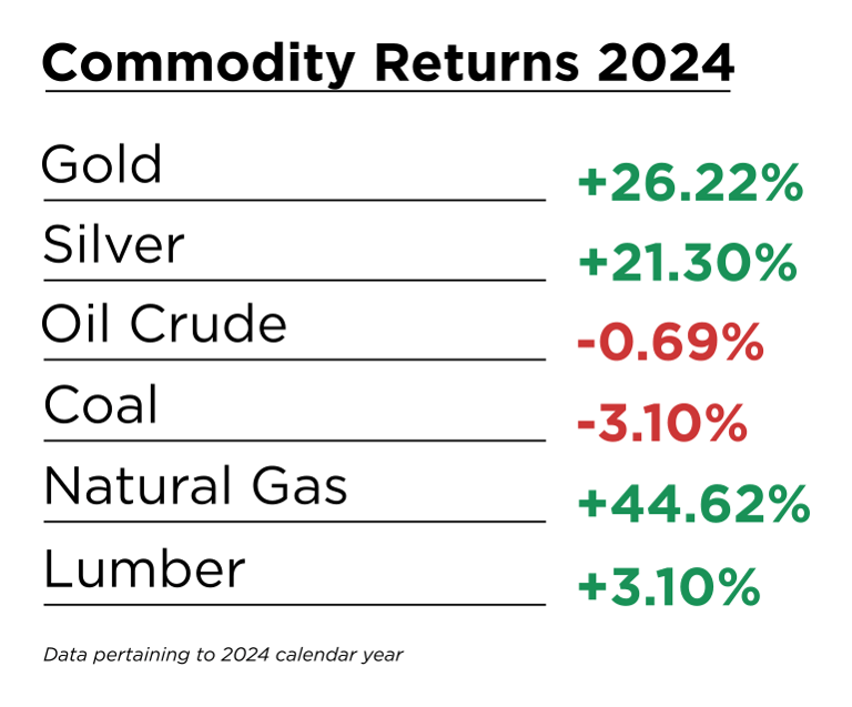 Just as stocks and index markets have impacts on our finances, changes in commodity prices do as well. Commodities generally move a lot more per week than stock indexes ever would. Gold and silver are two important commodities to watch out for investors, as many invest in these two. Gold increased a remarkable amount last year, increasing 26.22% from December 30th, 2023 to December 29th, 2024. Silver also did extremely well, increasing by 21.3%. Now, gold and silver are two investment commodities, but what about the other commodities we watch that affect energy, food, and other prices day-to-day? Well, we also watch four other commodities in our weekly newsletter, which are: oil (crude), coal, lumber, and natural gas. We feel these four commodities affect consumers the most and give us a good idea of how other commodities are doing. Oil didn’t move much last year, it only decreased by 0.69%. Coal declined even more than oil, decreasing by 3.10%. Unlike those two, natural gas increased a whopping 44.62%, going from $2.51 to $3.61. Lastly, lumber only increased a measly 3.1%. The changes in commodities last year have greatly helped individuals, both from an investment point of view and as a consumer.