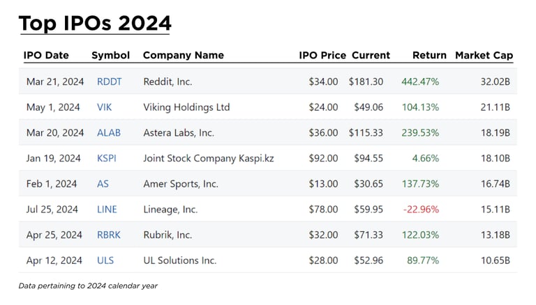 IPOs, or initial public offerings are how a company offers shares to the public and becomes a public stock. There were a few large IPOs that were released in 2024, of them, the largest by far was Reddit, Inc. with the ticker RDDT. Reddit’s IPO was priced at $34 when it was released in March, which was the initial price you could buy the stock for. The end of 2024 share price was at $173.54, which is a return of 410.41%. Along with Reddit, Viking Holdings Ltd and Astera Labs, Inc. also released IPOs in 2024. These two companies currently have market caps hovering around $20 Billion. There are many more IPOs from 2024, but we won’t get into the large list of 225 of them here.