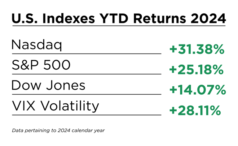 Politics stole the headlines throughout 2024, with many major heads of state being elected worldwide. However, the finance industry was still a well-oiled machine within the United States. Take this as you will, but those who invested in the U.S. stock market and other securities had a great year. When investing, it’s important to look at the historical changes in stocks and indexes in the U.S. and worldwide. Through this data, one can find undervalued and even overvalued stocks to invest in/short. In this article, we’ll take a look at the returns from the three largest U.S. indexes, along with indexes around the world in major continents. Commodities and forex are important markets to consider the cost of living, and we’ll see how these have changed throughout 2024.